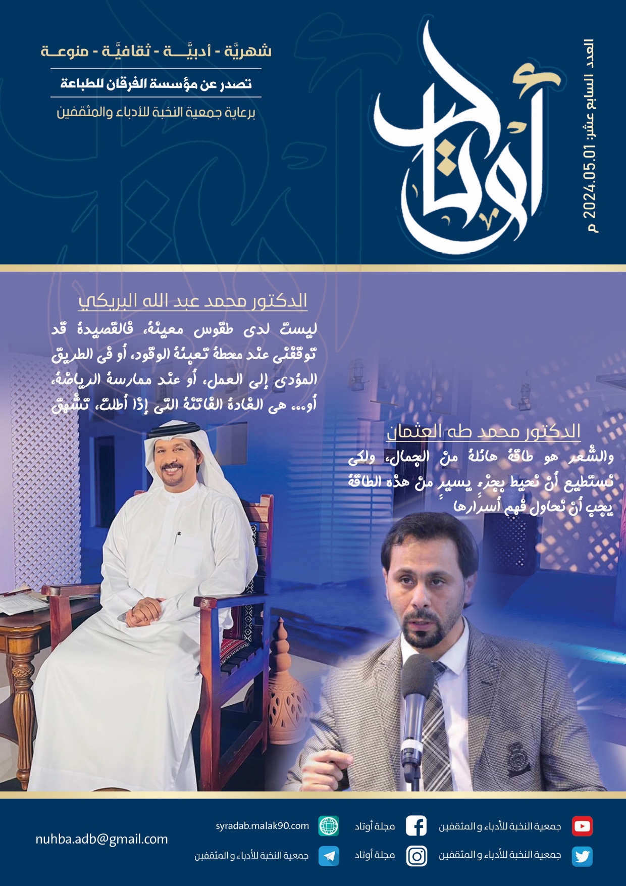نحتفي وإياكم بإصدار العدد الحادي والعشرين من مجلة (أوتاد) - الورقية الإلكترونية - برعاية جمعية النخبة للأدباء والمثقفين في تركيا، ونبارك لنا ولكم هذا العمل المائز راجين من الله أن يكتب لنا التوفيق والسداد في كل عمل، وأن يجعل لهذه الإطلالة نافذة أمل قريب وبوابة فجر مشرق لأمتنا وبلادنا.لتحميل المجلة كملف Pdf للقراءة بدقة عالية